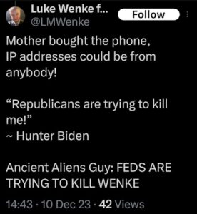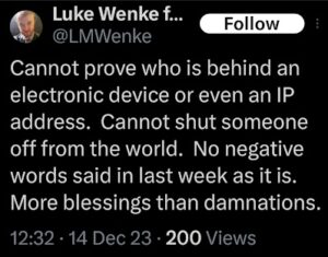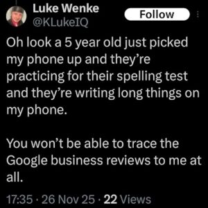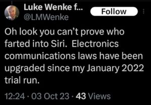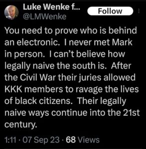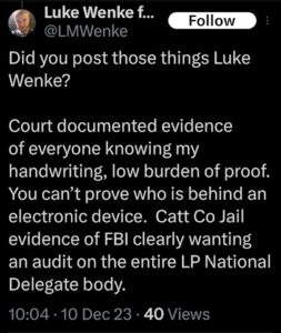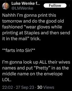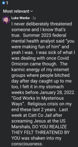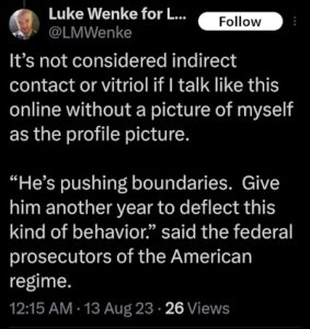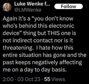 Of course, Wenke probably won’t ever admit to being the person behind those text messages, just like he denied sending harassing letters to his victims after blatantly admitting to it on social media (see the 2023 collection below). Here are some examples reflecting this pattern of Wenke thinking he’s slick, at times even taunting his targets in an “I know you know, but you technically can’t prove it was me” sort of way. To add insult to injury, he also accuses me and others of impersonating him and doing other things that he’s actually doing.
