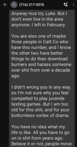 Luke Wenke has an established habit of bothering people in ways that no one else would, then denying it when he gets called out for it. For example, the screenshot below shows a message that Wenke sent me about the long-defunct message board website Topix in the spring of 2021. I would later discover screenshots of messages he sent to other recipients from the same number claiming to be Carl Paladino (see below).