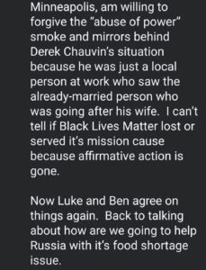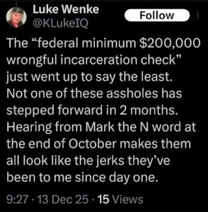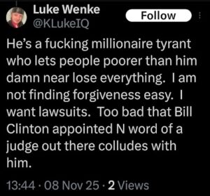 Throughout the vast majority of our friendship, I never knew Luke Wenke to be racist (or prejudiced in any fashion). I started noticing that side of him in 2018 or 2019, when I already had one foot out the door and couldn’t get the other foot out quickly enough. Since then, Wenke has become very open and brazen about his racist and hateful views. I don’t know if his bigotry has deepened over the years, or if it’s always been there and he just kept it to himself for a very long time. But his beliefs and conduct have no place in my life or in civilized society, and I’m sharing the following screenshots because people deserve to know when someone harbors these types of views so they can make informed decisions about whether to associate with or go near that person in the future.