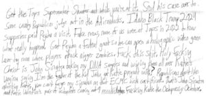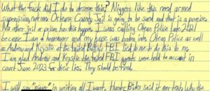 Transcription of Excerpt: “What the fuck did I do to deserve this? N—–s like this need armed supervision, not me. Orleans County Jail is going to be sued and that is a promise. No other jail or prison has this happen. I was calling Olean Police late 2021 because I am a homeowner and my house was broken into. Olean Police as well as Andrew and Krystie at the failed Buffalo FBI lied to me to do this to me. I am glad Andrew and Krystie the failed FBI agents were held to account in court June 2023 for their lies. They should be fired.
